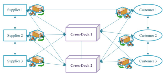 Logistics strategy is an essential advantage for supply chain management operations that requires centralized planning and adjustment of procedures to reduce costs and increase customer satisfaction [1,2]. Classic supply chain management for transporting goods from suppliers to the distribution centre requires warehousing for storage [3] and then packaging and shipping to customers [4], according to their demand [5]. This form of supply chain management has high inventory maintenance costs and human resources costs [6,7]. In other words, there are four stages of receiving, storage, order selection, and sending in traditional warehouses [8]. Still, in the cross-dock, the storage stage, one of the main obstacles of inventory systems, is removed [9,10]. Therefore, it reduces inventory and increases customer satisfaction [11]. Cross-dock is a logistic method that distributes products directly from a supplier or factory [12]. The cross-dock method ensures timely transportation and better coordination between supply and demand [13]. In recent years, one of the issues facing the supply chain was clean production and environmental protection [5]. One of the critical issues of clean output is using supply chains that pay attention to environmental issues in all supply chain processes [14,15].