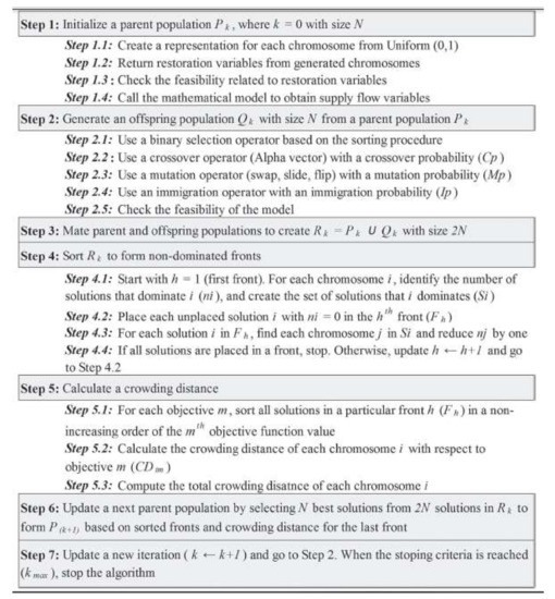 Charles Darwin’s theory, proposed in 1859, occupied a special place in optimization problems [38]. This theory is based on the best evolution, and it can be considered a starting point for evolutionary calculations. Genetic algorithms are random search algorithms whose idea is derived from nature. Genetic algorithms for classical optimization have successfully solved linear, convex, and similar problems, but genetic algorithms are much more efficient for solving discrete and nonlinear problems [39]. In nature, better generations emerge from a combination of better chromosomes. In the meantime, there are sometimes mutations in the chromosomes that may improve the next generation. Genetic algorithms also use this idea to solve problems [40]. Figure 2 show the schematic procedure of the NSGA-II algorithm, and then the details of the proposed genetic algorithm are described.
