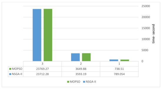 Execution time—One of the crucial criteria for measuring the performance quality of an algorithm is its execution time, which in some articles is also referred to as execution speed. This criterion becomes essential when the dimensions and complexity of the problem increase. The execution time of these four methods in the three levels of small, medium, and large sample problems are given in Table 19 and Table 20 and Figure 3. In general, the NSGA-II algorithm is more acceptable in terms of average runtime at both medium and large sample problem levels.