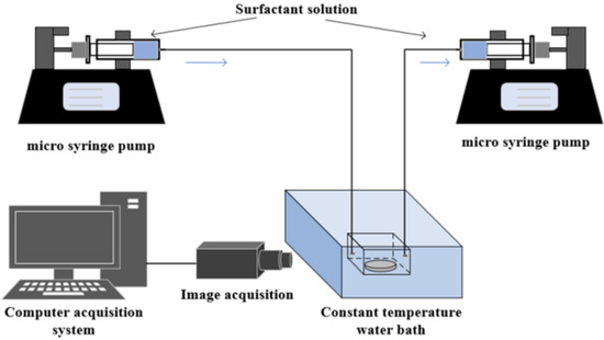 - The micro syringe pump was filled with surfactant solution. The injection pump was turned on to inject it into the sample container at a constant flow rate of 1 mL/min. At the same time, in order to ensure that the liquid level in the container was always the same, the extraction pump was also turned on at a speed of 1 mL/min;