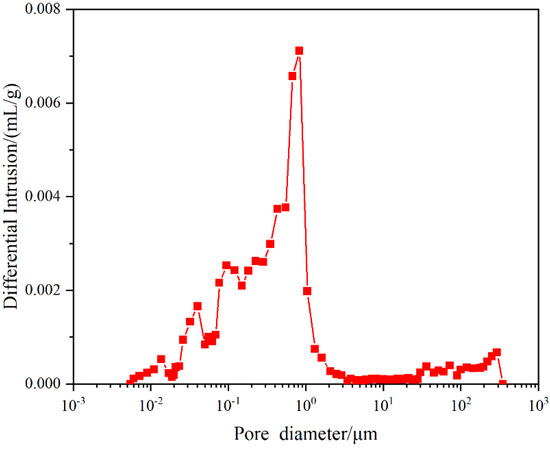 The high-pressure mercury intrusion experiment is an important way to obtain the characteristic parameters of reservoir rock pore throats [32]. The basic principle of high-pressure mercury injection is that the non-wetting phase mercury overcomes the capillary resistance and enters the pores. The core sample was put into a closed dilatometer and evacuated for testing. The mercury injection process was a step-by-step pressure increasing process. After the pressure was stable, the accumulated mercury inlet saturation under this pressure was measured, and the volume of mercury entering the pore represented the volume of the connected pore under this pore throat size.