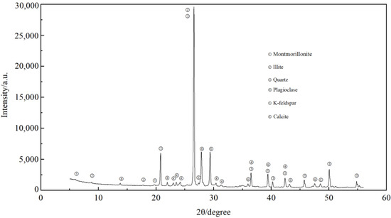 The wettability of sandstone is affected by the relative content of hydrophilic minerals (Quartz, Illite), intermediate wettability (Calcite, Feldspar), and lipophilic minerals (Illite and Montmorillonite mixed layer, Chlorite), and the imbibition effect is related to the wettability [33]. The mineral X-ray diffraction pattern of the core sample is shown in Figure 3, and the main mineral content in the core sample is shown in Table 2.