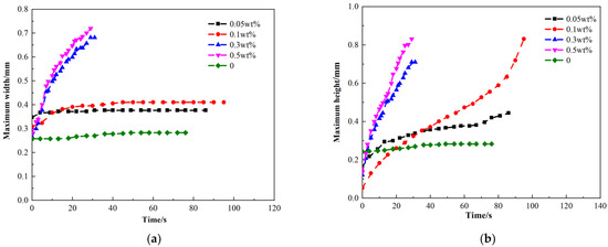 The main driving force affecting the occurrence of imbibition is capillary force, and IFT is a major factor affecting capillary force. In this part of the experiment, the behavior of oil drop discharge under different oil/water IFT conditions (Figure 6) was investigated. ASB surfactant solutions with mass concentrations of 0.05%, 0.1%, 0.3%, and 0.5% were selected, the oil-saturated core chips were immersed in surfactant solution with different concentrations and synthetic formation water respectively, and the discharge process at 80 °C was observed and recorded. The maximum height and width of oil drop are used to reflect the size of the growth of oil drop. The experimental results are shown in Figure 7: