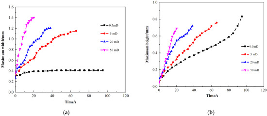 Change of oil drop size on core chips with different permeability. (a) Comparison of maximum width of oil drop; (b) Comparison of maximum height of oil drop.