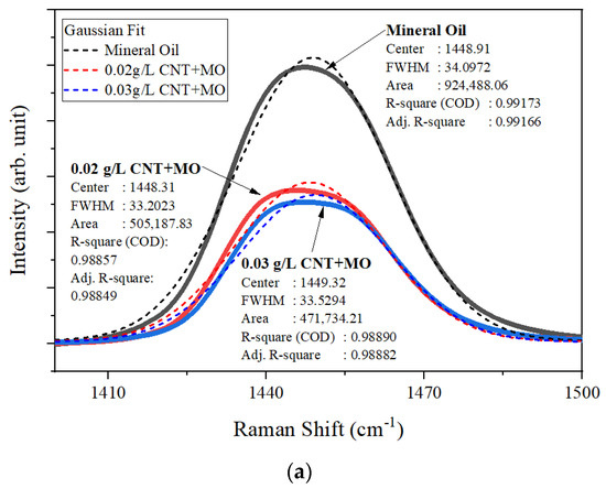 The Raman spectra at 1448 cm−1 region for (a) mineral oil and mineral oil with 0.02 g/L and 0.03 g/L CNT, (b) palm oil and palm oil with 0.02 g/L and 0.03 g/L CNT.