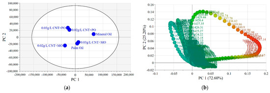 The first PC (PC1) was dominated by a positive loading coefficient centered on characteristic mineral oil Raman bands; 1609, 1454, 1380, 1356, 1161, 1050, and 773 cm−1 (Figure 8c). Observed can be that the palm oil after being dispersed with 0.02 g/L and 0.03 g/L concentration of CNT is located at the upper left area and clustered together, which represents a similar structure profile and positively correlated to each other. Both concentrations depict a negative score for PC1 but a positive score for PC2 (Figure 8a). This is because of characterization caused by the intense band at the 1650 cm−1 region, which represents higher content of C=C stretching vibration compared to the palm oil after being dispersed with CNT. The application of PCA combines distinct spectral areas and allows additional information to be retrieved from the spectral data, which leads to a comprehensive study concerning independent datasets.