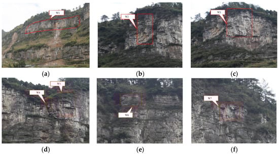 Profile of perilous rock. (a) W1 perilous rock; (b) W2 perilous rock; (c) W3 perilous rock; (d) W4, W5 perilous rock; (e) W6 perilous rock; (f) W7 perilous rock.