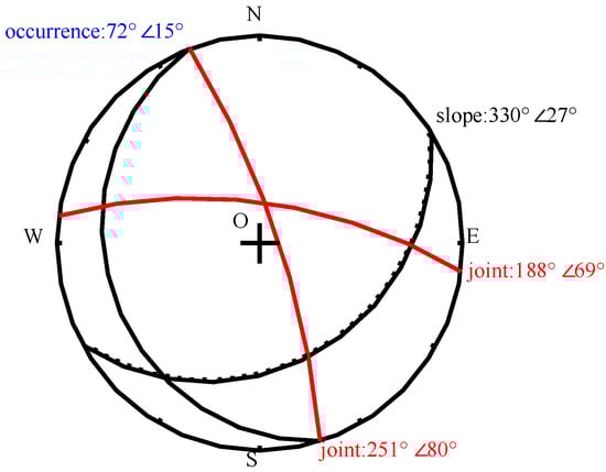 A stereographic projection is a software-based approach used to judge the stability of a slope [,]. Using the geological occurrence of the plane and straight line obtained in the field, the relevant parameters of the related inclination can be obtained. Using the angular distance relationship, the perilous rock in the study area is reflected in the projection plane for analysis and processing, and the stability of perilous rock is preliminarily judged. This method can simplify the complicated calculation process, and has the advantages of being intuitive and convenient.