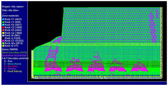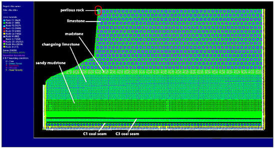 The perilous rock studied in this paper has two types: falling type and dumping type. Because the W6 perilous rock is in a stable state, the remainder of the perilous rock is basically either stable and unstable. Therefore, the simulation used the W6 stable perilous rock as the research object to judge the influence of coal seam mining on the W6 perilous rock. The numerical model established a two-dimensional model of coal seam mining at the location of perilous rock W6 as a section. The boundary conditions of this study were determined according to the actual situation. The bottom and both sides of the model are zero displacement boundary conditions. The upper part of the model and the perilous rock are free boundaries, which are mainly subject to gravity stress. The gravity stress of the original rock is applied on the upper boundary [,], and the gradient horizontal stress is applied on the left and right boundaries of the model. Due to the small dip angle of the coal seam, the horizontal model was established as follows: