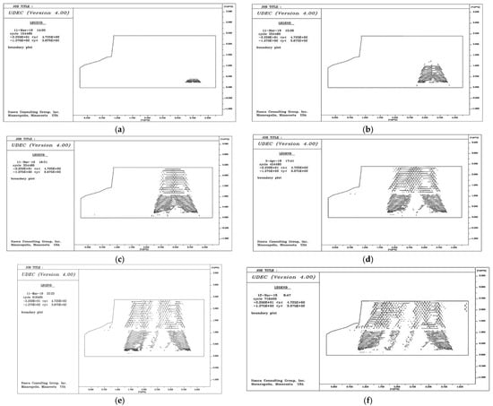 The two-dimensional model of C3 coal seam mining was established by taking the location of the W6 perilous rock mass as the section to carry out the numerical simulation. According to the mining conditions of the C3 coal seam in the coal mine studied in this paper, 50 m coal pillars were placed at the left and right ends, and the simulation was carried out in 50 m units in front of the working face to accurately represent the mining situation of the C3 coal seam in the coal mine. According to the simulation results, two kinds of fractures occurred in the simulation: separated fractures and broken fractures [].