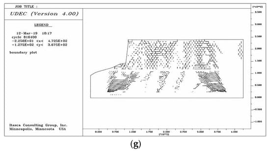As shown in Figure 6a, when the working face is mined to 50 m, coal mining only leads to local cracks above the goaf of the working face, which has little effect on the overlying strata far from the coal seam. When the working face is mined to 100 m, the fracture is still located above the goaf as a whole, but its development range is larger. The transverse separation fracture and longitudinal separation fracture are connected, and the fracture continues to develop upward, but it has little effect on the surface perilous rock, as shown in Figure 6b. When the working face advances to 150 m, due to the continuous mining, the fracture at this time has developed to the position close to the surface; however, it has not yet been connected with the surface, and is at a distance of about 10 m from the surface. At this time, the fracture is still far from the surface perilous rock, and has little influence on the perilous rock, as shown in Figure 6c. When the working face advances to 200 m, as the coal seam continues to be excavated, the fractures continue to develop in the direction toward the working face. The previous fracture zone continues to be compacted, and new fracture zones appear. At this time, above the position of mining at about 200 m, there are separate cracks connecting with the surface, and there are also upward cracks in the adjacent position. The surface at this position has shown obvious subsidence, but the influence of mining on the perilous rock mass has not been seen, as shown in Figure 6d. When the working face advances to 250 m, the fracture continues to develop in the direction of mining. At this time, the fracture is about 50 m from the horizontal distance of the goaf, and there is a local fracture at 10–40 m below the corner of the slope. This fracture is not connected with the previous fracture, and the fracture is located directly below the perilous rock. If the mining is continued, the fracture will have a great impact on the surface perilous rock. When the working face advances to 300 m, as the mining advances to the lower right side of the perilous rock, the rock strata in the goaf have fully collapsed, and collapsed to the floor with the advance in mining. The surface also has different degrees of depression. The rock strata have obvious vertical fracture cracks, and there are many fractures above the goaf and coal wall. The mining has a significant impact on the overlying strata, and the upper rock strata of the roof are greatly affected by the mining. At this point, the cracks at the foot of the slope and above the goaf have been partially penetrated, and the cracks are close to the perilous rock as a whole, as shown in Figure 6f. When the working face is advanced to 350 m, the fracture has penetrated with the surface of the perilous rock, and the perilous rock has not yet collapsed. However, the existence of the fracture has an extremely unfavorable impact on the stability of the perilous rock, as shown in Figure 6g.