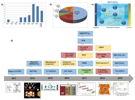 Wang and Buchmeiser [16] reported that the number of studies on rechargeable Mg–S cells (Figure 2c) has recently significantly increased (Figure 2a). A timeline of various findings relating to the Mg–S cells in the time range from 2011 to 2019 is shown in Figure 2d. Figure 2b comprises an overview of the topics addressed in papers relating to Mg–S cells. From such a survey, it is clearly visible that studies on novel electrolyte systems, modifying sulfur cathode materials, and mechanistic studies were significantly preferred. By contrast, only a few studies concerned the other components of an Mg–S cell, such as the anode and the separator.