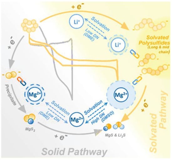 Although the design of the Mg–S cell was and is often modelled on that of the Li–S cell, the chemical reactions occurring in both types of cells differ from each other. The different reaction pathways affected by the preferential stabilization of S22– and S42– in the presence of Mg2+ and Li+ are shown in Figure 3 [28].