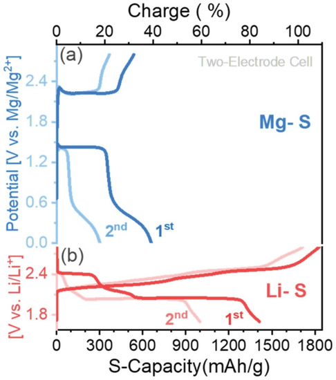 The differences in the chemical reactions taking place in the Li–S cell and in the Mg–S cell have a great influence on the characteristics of such cells. Two subsequent galvanostatic discharge/charge profiles of Mg–S and Li–S two-electrode cells are shown in Figure 4. Such profiles point out that the Mg–S cell has limited discharge capacity, large polarizations, and rapid capacity decay [28].