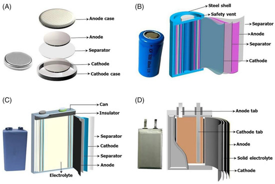 Schematic illustrations of typical rechargeable battery configurations: (A) coin; (B) cylindrical; (C) prismatic; (D) pouch shapes. Taken from [31].