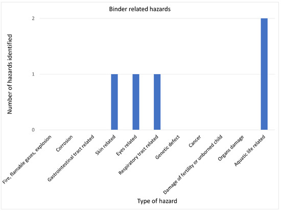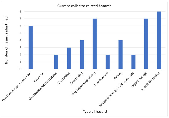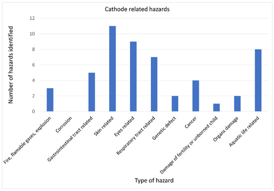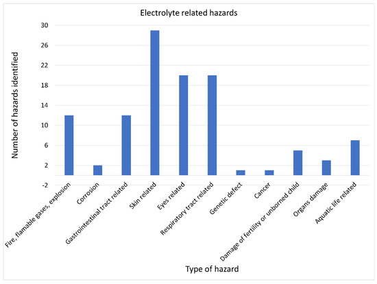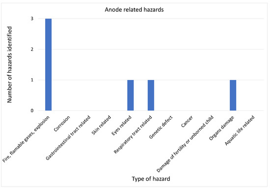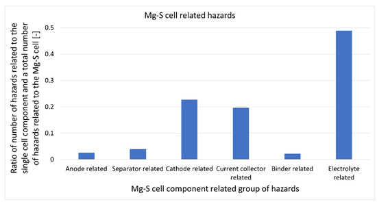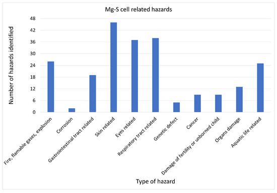 Various hazards related to the use of materials for anodes in Mg–S cells are presented in Figure 6. The largest number of the hazards identified belonged to the hazard group related to the possible occurrence of fire, flammable gas, or an explosion. Three single hazards were identified that referred to the hazard groups related to the toxic or allergic effects on eyes, the respiratory tracts, and the generation of damages to organs, respectively.