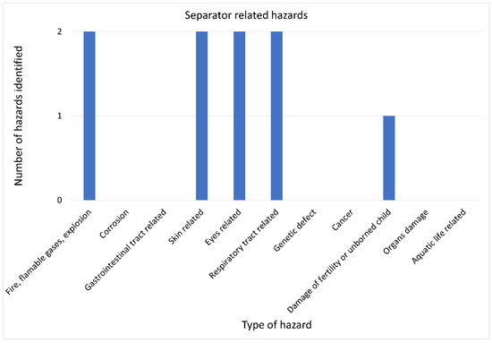 Various hazards related to the use of materials for separators in Mg–S cells are presented in Figure 7. The four pairs of the identified hazards belonged to the hazard group related to the possible occurrence of fire, flammable gas, or an explosion, and the hazard group related to toxic or allergic effects on skin, eyes, and the respiratory tracts, respectively. A single hazard was identified and referred to the hazard group related to the generation of damages to fertility or an unborn child.