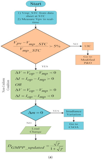 The proposed hybrid technique in this work uses the modified perturb and observe, along with the recently developed chimp optimization algorithm (ChOA) [27]. To accomplish the objective of efficient global maximum power point (GMPPT) tracking under uniform irradiance change, non-uniform irradiance change (i.e., partial shading), and load variations, the actual operating conditions of a PV system are identified first. After that, based on the identified situation, modified P&O or ChOA are employed for successful tracking of maximum power point (MPP). The proposed method is divided into three phases, as shown in the flowchart of Figure 5. These phases are explained here as follows.