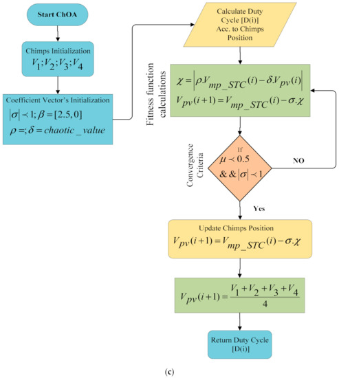 (a). Flowchart for identification of operating conditions. (b) Flowchart of the modified perturb and observe algorithm. (c) Flowchart of the chimp optimization algorithm.