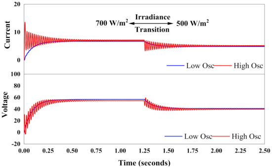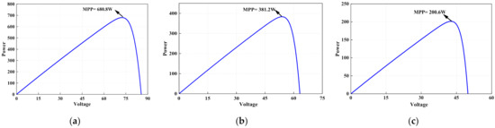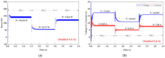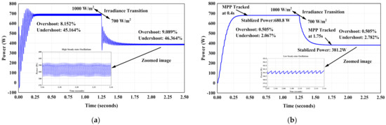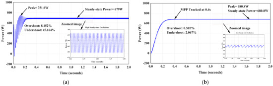 Initially, the PV array is fully irradiated (1000 W/m2), and according to the flow chart of Figure 5a, the PV system is operating under the uniform irradiance condition; thus, the modified P&O algorithm is initialized to track the exact MPP with reduced oscillations under the steady-state condition as explained in Section 6. Figure 7a,b shows the output power characteristics at standard test condition (i.e., 1000 W/m2, 25 °C) with a rated power of 688.524 W. The power curve in Figure 7a has large initial and steady-state oscillations. The highest spike has a value of 751.9 W, which is 72.9 W more than the actual steady-state value of 679 W. These oscillations have an overshoot of 8.152%, while undershoot is 45.164%. These high oscillations destabilize the PV system and reduce its overall efficiency. To overcome these undesirable fluctuations, the proposed modified P&O triggers with the initial perturbation step of ∆D = 0.002, and as it reaches the vicinity of MPP and identifies oscillations, it starts to further reduce the perturbation size to minimize the oscillations around MPP and stabilize the power. The output power curve in Figure 7b proves the validity of the proposed modified P&O’s performance in reducing the high initial and steady-state oscillations. The MPP is tracked in just 0.4 s with a steady-state efficiency of 98.87%. The highest spike, in this case, is the same as steady-state stabilized power of 680.8 W, while overshoot and undershoot values are reduced to 0.505% and 2.067%, respectively. Similarly, voltage and current characteristics with high oscillations (without P&O) and low oscillations (with modified P&O) are shown in Figure 8. While, The PV curves of uniform irradiance cases considered in this study are shown in Figure 9.