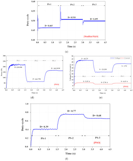 The upper and lower duty-cycle thresholds are set to 0.60 and 0.40, respectively. These values are set to ensure MPP lies between them. The algorithm initiates with an initial duty cycle of 0.45 and scans the PV curve with a perturbation step of 0.002. The initial voltage (Vpre = 0) and power (Ppre = 0) are defined as previous voltage and previous power and set to zero value. Similarly, the oscillation counters osc_1 and osc_2 are set to zero. The voltage and current of the PV system are measured using measurement devices, and power is calculated. These PV voltages (V) and power (P) values are compared to previously initialized voltage (Vpre) and power (Ppre). If power change is zero (), the algorithm updates the ‘D’, ‘Vpre’, and ‘Ppre’ values and starts the process again. However, if the change of power () is non-zero, the algorithm tracks the MPP and checks for the possibility of steady-state oscillations. If both voltage and power change are negative, the oscillation counter 1 (osc_1) will be incremented by 1. However, a positive change of voltage value causes the oscillation counter 2 (osc_2) to be incremented. On the other hand, if the changes of both voltage and power are positive, the oscillation counter 2 (osc_2) will be incremented, while a positive change of power and negative change in voltage value increments the oscillation counter 1 (osc_1). The algorithm calculates and compares the power and voltage values and checks for osc_1 and osc_2. If the oscillation counter 1 and 2 both have values of 2 or greater, the algorithm considers this as oscillations around the MPP. In the case of oscillations, the perturbation step size is further reduced to minimize the steady-state oscillations. The upper and lower bound duty-cycle values reveal that the finalized duty-cycle ‘D’ is the required value for an oscillation-free steady-state condition. The ‘Dinit’, ‘Vpre’, and ‘Ppre’ values are updated accordingly, as shown in the flowchart of Figure 5b. These upper and lower duty-cycle thresholds define the MPP region and help to avoid the divergence problem.