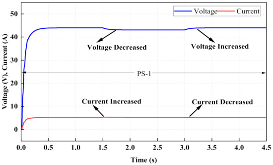 Load-varying conditions (LVC) are investigated by examining the OP behavior on the PS curve of Figure 3. At the rated load condition, the system is operating at maximum power point A with voltage Vmp = 56.15 V and current Imp = 6.84 A. An increase in load causes the OP to move from point A on load line L-1 to point B on L-3. This new OP has a voltage of Vpv3 = 60.01 V more, while the current (Ipv3 = 4.947 A) is less as compared to Vmp and Imp at point A. However, a decrease in load forces the OP to shift to point C on L-2 causing a decrease in voltage (Vpv2 = 46.78 V) and an increase in the current (Ipv2 = 7.251 A) in comparison to Vmp and Imp at point A. As a result, load variations can be identified if the expression in (5) has been satisfied [35].