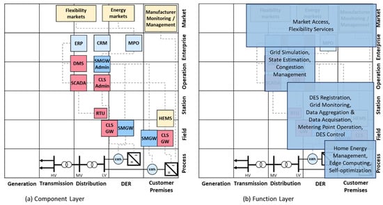 Representation of the DES integration in smart grids using the SGAM methodology [] (pp. 67–73): The component layer contains operational components (red), DSO systems (light blue), security-relevant components (deep blue) and other systems (yellow). Abbreviations: ERP: Enterprise Resource Planning; CRM: Customer Relationship Management; MPO: Metering Point Operation; DMS: Distribution Management System; SMGW: Smart Meter Gateway; CLS: Controllable Local System; RTU: Remote Terminal Unit; HEMS: Home Energy Management System; SMGW Admin: SMGW Administrator; CLS Admin: CLS Management and Backend System; kWh: smart meter.