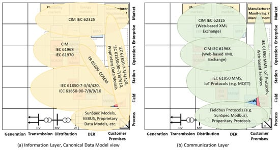 IEEE 2030.5/SEP2, IEEE 1815/DNP3 and SunSpec Modbus: In the USA, these standards are constantly being adjusted for the integration of DES. The IEEE 2030.5 Smart Energy Profile 2 (SEP2.0) has been extended using IEC 61850-7-420 logical node classes for DER components to meet DER integration requirements for CA Rule 21 []. The SunSpec Alliance has designed the SunSpec Public Key Infrastructure (PKI) and extended the SunSpec Modbus specification with the 700 series along with the DER information model to enhance the DER access for stakeholders including DSOs. To include standardized interoperability functionality, the IEEE 1547 standard was updated in 2018 with a specification for technical requirements relevant to the performance, operation, testing, safety considerations and maintenance of the interconnection of DES in electrical grids []. In terms of physical interconnection requirements and test procedures for DER, the work in [] delivers an overview on the evaluation of DER interoperability to IEEE 1547.1 for SunSpec Modbus DER, IEEE 1815 and IEEE 2030.5.