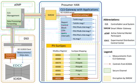 Representation of the communication architecture of a CLS gateway with a high IT-security level by utilizing the German Smart Meter Infrastructure. In this example, the SunSpec-compliant measurements, device information and control commands of a PV inverter are converted to data attributes in an IEC 61850 data model, which additionally provides DSOs with the basics for the telecommunication to this PV inverter.
