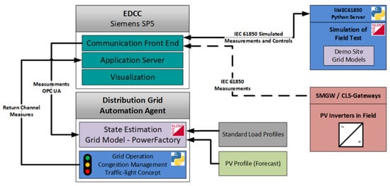 Process diagram of the whole real-time simulation environment; this paper focuses on the integration of the grid model defined by the libiec61850 Python server into the EDCC as well as enabling the data interface between EDCC and the Distribution Grid Automation Agent.