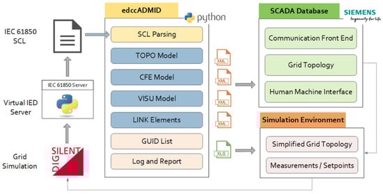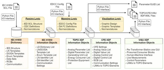 Regarding the utilization of CIM, ENTSO-E has developed CIM profiling tools to simplify the manual CIM modeling process by utilities, mainly TSOs []. Regarding the CIM models for the distribution power grid, one possible automation mechanism was demonstrated in [], where the CIM models were used as a centralized information exchange platform and different CIM adapters were implemented to enable the bidirectional information conversion. However, this CIM platform did not involve the DES characteristics; for further development and optimization, an efficient automation approach is required. Other researchers introduced in [] a CIM-compatible Python library, which helps to parse, import and export CIM models between data systems for smart grid applications. Though, this toolkit does not cover the DES properties.