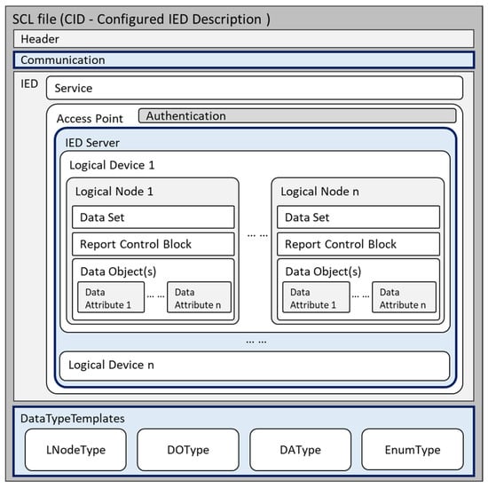 - With the hierarchic structure, IEC 61850 data models usually have a file-based representation, which is modeled as an Extensible Markup Language (XML) file coded with IEC 61850 specific Substation Configuration Language (SCL). Consequently, the file parsing process is uncomplicated, and the modeling of internal links between grid element parameters and communication unit parameters or graphical objects can be implementable by modification of the XML file.