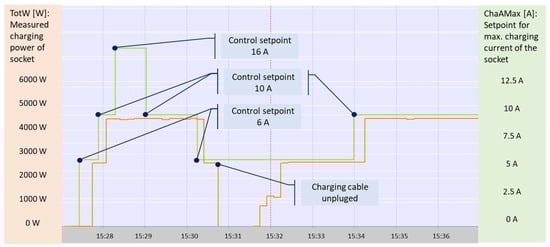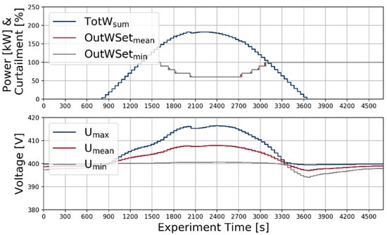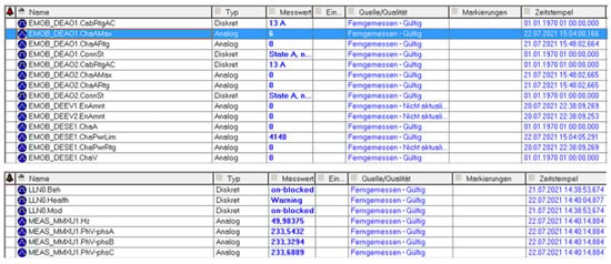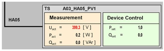 The Experimental Distribution Control Center (EDCC) at THU is the second important software and hardware component. The core functionality is based on a SCADA system with the type of Spectrum Power 5 by Siemens AG []. Although the EDCC is named an experimental system, it is equipped with the same sub-systems and functionalities as the industrial product used worldwide by many grid operators. More specifically, it consists of information management, database, real-time environment, communication interfaces and IT-security relevant components. The data storage in Spectrum Power 5 is based on an embedded Oracle database, and WinCC is integrated as a visualization tool and machine–machine interface. Besides, an integrated OPC UA interface can be used for the data transmission between Spectrum Power 5 and the simulation environment or external databases such as InfluxDB []. In the remaining parts of this paper, the term EDCC will be used instead of the general term SCADA when the technical implementation or test procedure refers to this grid control system at THU.