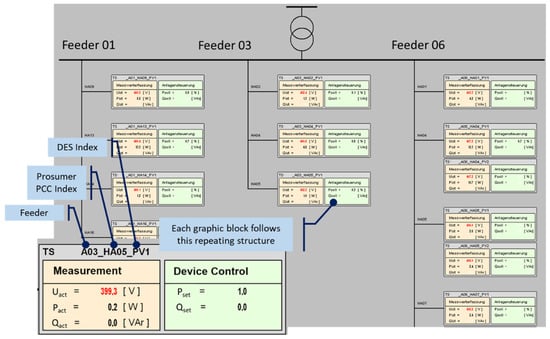 Compared to Use Case 1, the basic concept of the automation approach remains the same, whilst the data nodes in this model have a high duplicating character, as the measuring devices for each household or PV system may have a relatively similar data structure containing several analog measurements. Therefore, the Point of Common Coupling (PCC) of each household could be modeled as units with repeating nomenclature, which in the meantime facilitates the automated generation of GUI for grid operators. The simulation environment is presented in Figure 5, in which the script package has the task to automatically integrate this grid model including graphical elements in EDCC as a sub-geographical region supplied by one transformer station.
