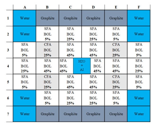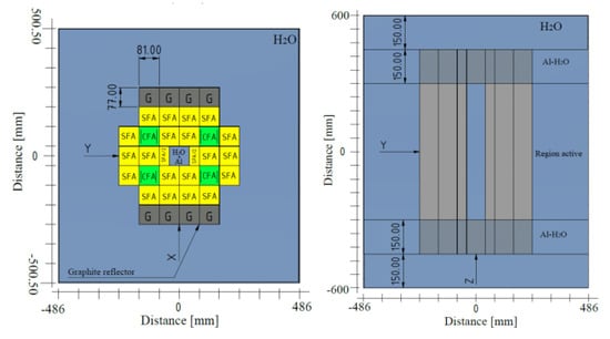 The reactor data and the transient scenarios used for these investigations are provided and defined in the IAEA-10 MW benchmark [14,15]. The IAEA-10 MW Highly Enriched Uranium core consists of a 5 × 6 grid core containing 21 Standard Fuel Assemblies (SFAs) and 4 Control Fuel Assemblies (CFAs). It is radially reflected by graphite on two opposite sides and surrounded by light water, as shown in Figure 1. In addition, according to recommendations [15] (p. 15), a 77 mm × 81 mm aluminum block containing a 50 mm water-filled square hole on each side should be considered in the analysis.