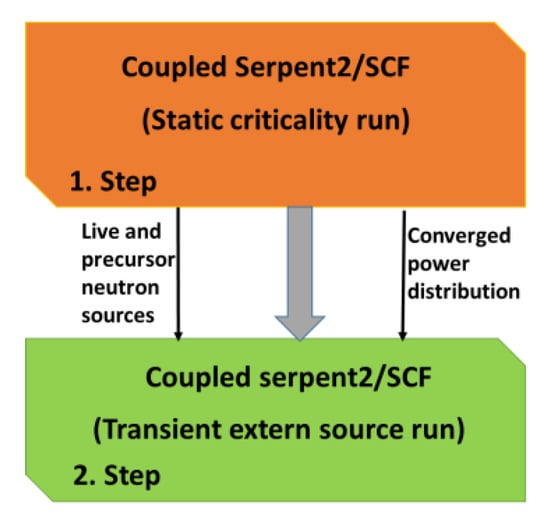 After step one, the transient external source calculations start using the initial live neutron and delayed neutron precursor distributions previously stored in the dump files. According to the coupling approach, an initial SCF run is performed using the converged power profiles predicted by Serpent 2 during the static coupled calculation of step 1.