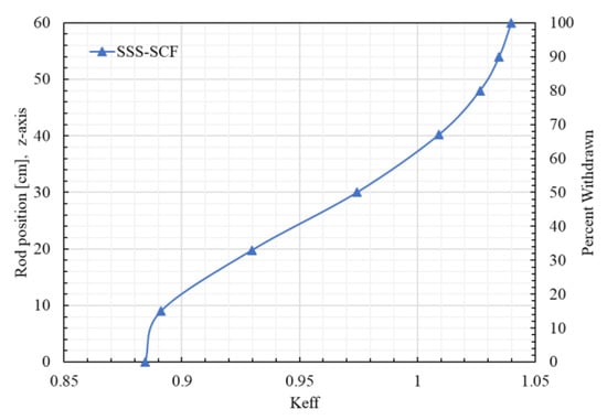 Figure 8 shows the variation of the effective multiplication factor () for different positions (0 cm: full inserted, 60 cm: full withdraw) of the eight control plates for the MTR core loaded with HEU at BOL conditions, as predicted by Serpent2/Subchanflow. In Table 3 the critical control rod position determined by a linear interpolation between two points at 30 cm and 40.2 cm from the bottom position of the active region is exhibited, with the error bar and the statistical uncertainty of the multiplication factor.