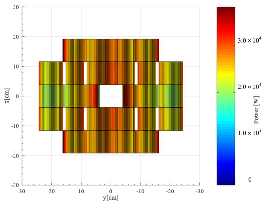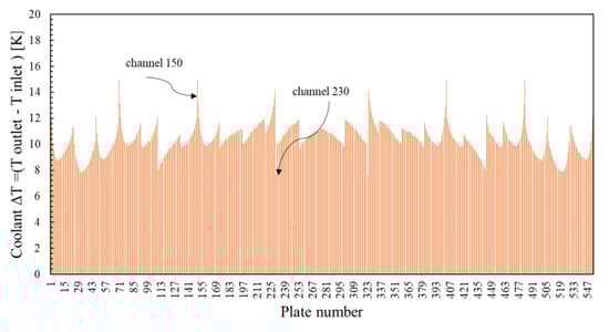 The novel capabilities of the Serpent2/Subchanflow simulations at the plate/subchannel level make it possible to evaluate the behavior of each fuel plate and subchannel considering the local feedbacks between neutronics and thermal–hydraulics. The plate-by-plate power distribution of the MTR core is shown in Figure 9, where the location of the plates with minimum and maximum power can be easily identified. Additionally, Figure 10 shows the coolant heat-up of each channel of the core, where again the location of the subchannel with the hottest and coldest coolant temperature can be identified.