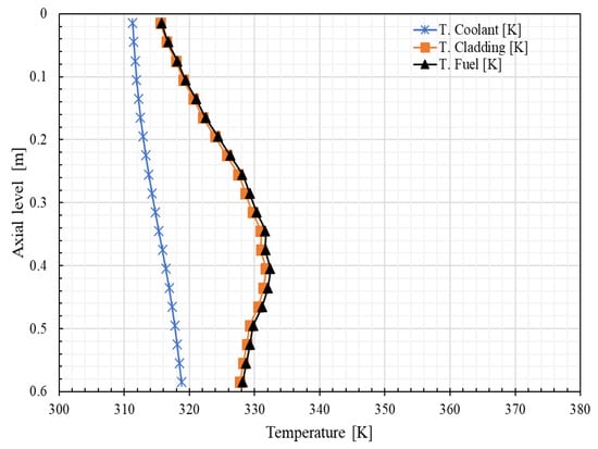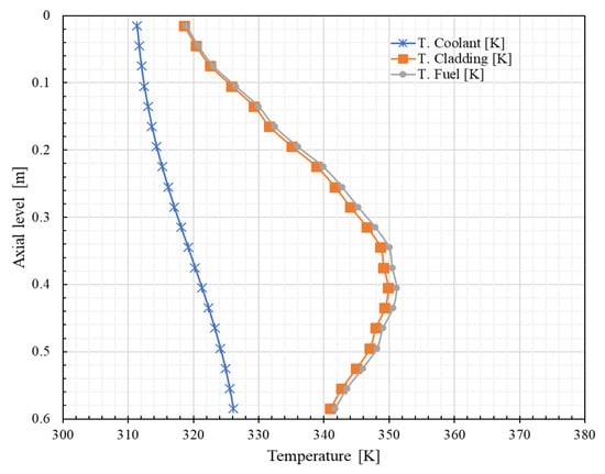 Finally, Figure 11 and Figure 12 show the axial temperature distribution profiles of the coolant, cladding and fuel of the hottest and coldest plate. The maximum coolant temperature value of 326.13 K is located at the core outlet (lowest part of the active region) and the coldest is 318.81 K. On the other hand, the maximum cladding and fuel temperatures for the hottest plate are at 40 cm measured from the top of the active region: 351.13 K and 349.81 K, respectively. The value of the coldest plate amounts to 332.6 K, while the one of the cladding amounts to 331.7 K.