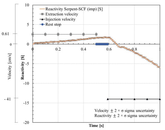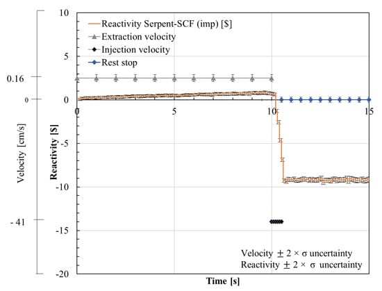 The control plate movements for the slow RIA (SRIA) event are presented in Figure 15. For Δt1 = 10 s, the control plates are extracted with a constant velocity of 0.16 0.1 cm/s leading to a reactivity increase of 1.0051$ . After the 10 s, the control plates are inserted with a constant velocity of −41 0.1 cm/s during Δt2 = 0.5 s, causing a reactivity decrease to −9.0027$ 0.007485. Finally, after the 10.5 s, the control plates remain at rest.