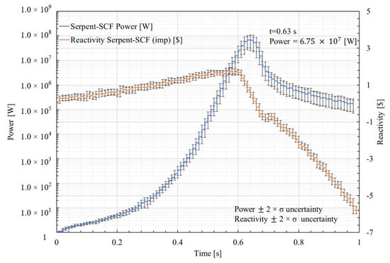 Predicted power and reactivity evolution during the FRIA scenario (1.5$/0.5 s) as predicted by Serpent2/Subchanflow.