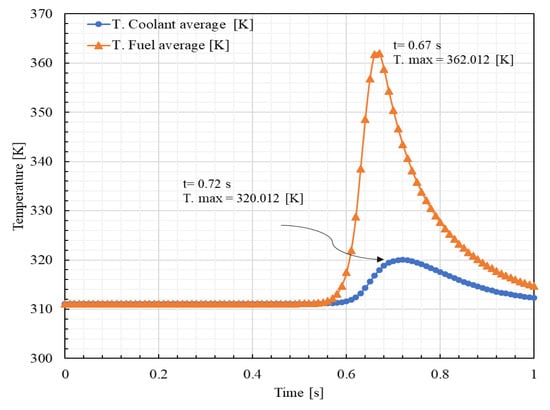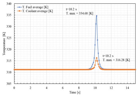 As shown in Figure 23, the core-averaged peak temperatures of the fuel and coolant are 334.68 K and 316.28 K, respectively. Both are found at the same time, 10.2 s. After 11 s there is no significant difference between the initial and final temperatures.