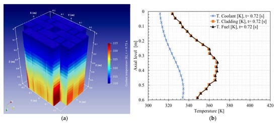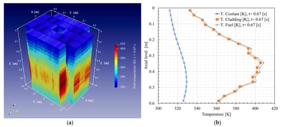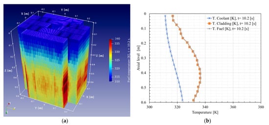 Finally, Figure 26a shows the radial and axial representation of the temperature of each of the plates at 10.2 s. In addition, Figure 26b presents the axial temperature distribution of the coolant cladding and fuel of plate # 403 at 10.2 s.