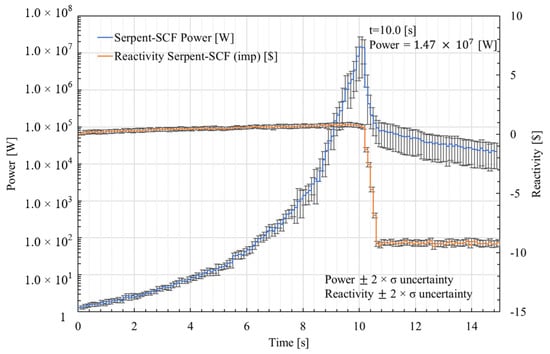 Global results:Figure 22 shows the evolution of the reactor core power during the first 10 s of the transient, together with the reactivity insertion. It can be observed that the power increases slowly due to the extraction of the control plates until 10.2 s. At 10 s, a maximum power of 1.47E7 W is reached. Afterwards, the control plates are inserted into the core, providing a negative reactivity of around −9.0027$/0.5 s. As consequence, the power decreases, reaching a value of W at 15 s.