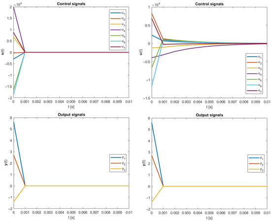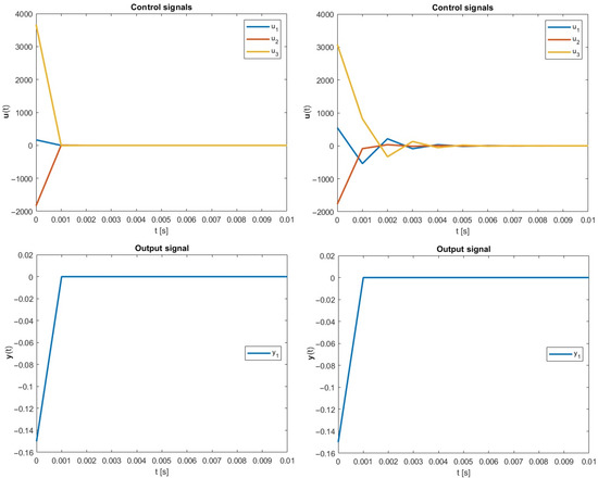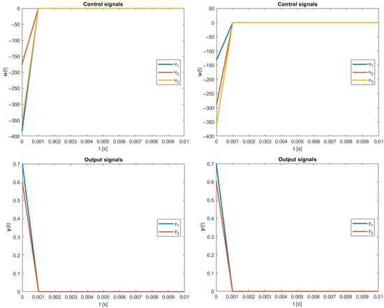As it can be seen in Table 1, in every considered simulation instance, the strategy based on the optimized -inverse is better than after the employment of the classical Moore–Penrose-related formula. Furthermore, results in output signals are the same for both methodologies. Thus, the new optimal energy control paradigm can be a good counterpart to this based on the obligatory well-known classical approach.