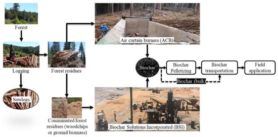 Forest residue logistics and biochar (pellet) processing through (a) Biochar Solutions Incorporated and (b) Air Curtain Burner [].