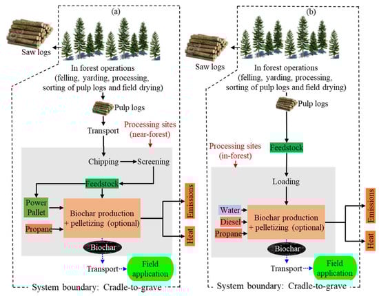 A lifecycle assessment (LCA) approach was used to estimate the environmental impacts of biochar produced from forest residues, making biochar pellets (optional), and applied to the soil. Techno-economic analysis was used to evaluate the technical feasibility and costs of biochar production systems. The primary data used in this study were compiled from the Waste to Wisdom (WTW) research project [], where experiments were conducted for forest residue harvesting, feedstock preparation, and biochar production with portable systems. The experimental data for biochar pelletizing were taken from the literature []. There were several scenarios studied that considered types of feedstocks, production systems, processing location, and sources of electricity used in operating the production systems []. However, this study focused on the biochar production at the near-forest (with BSI system) or in-forest (with ACB system) sites and delivered to end-users for field application as powder or pellets.