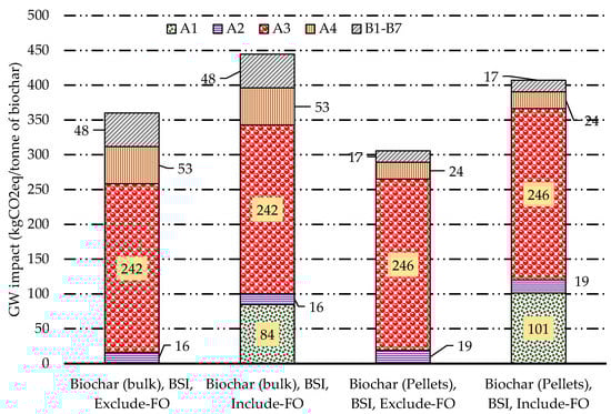Global warming impacts of field application of biochar, in pellet and bulk forms, using the BSI system, by considering the impact of forest operations (FO). (Note: A1: Timber harvesting and forest biomass collection, A2: Transportation of forest biomass, A3: Production of biochar and pelletizing (optional), A4: Biochar transportation, and B1–B7: Biochar applied to soil and stored for more than 100 years).