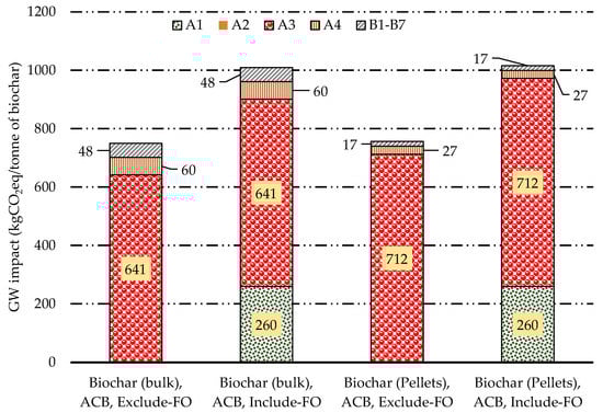 Global warming impact of field application of biochar, in pellet and bulk forms, using the ACB system, by considering the impact of forest operations. (Note: A1: Timber harvesting and forest residue collection, A2: Transportation of forest residues, A3: Production of biochar and pelletizing (optional), A4: Biochar transportation, and B1–B7: Biochar applied to soil and stored for more than 100 years).