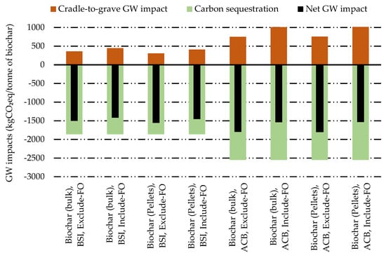 The cradle-to-grave GW impact and carbon stored in the soil as the biochar (>100 years) were considered for net-GW impact. This study considered that all labile carbon and a certain part of recalcitrant carbon in biochar will degrade within a 100-year time-frame []. Based on the literature [], it is estimated that after 100 years of land application of biochar, 80.5% of carbon in the biochar will remain stable and the remaining 19.5% will be emitted to the atmosphere. Thus, biochar carbon stability for a 100-year time-frame was considered to be 80.5%, which was used to estimate the net-GW impact of biochar.